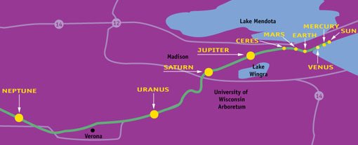 The PTDC Sun is located at Monona Terrace Convention Center in downtown Madison. Your trek through the solar system follows the Southwest Commuter Bike Trail, then the Military Ridge Bike Trail. PTDC ends at Pluto, which is located about 23 miles away from Monona Terrace in the village of Mt. Horeb. Here’s a scalable map of the route.